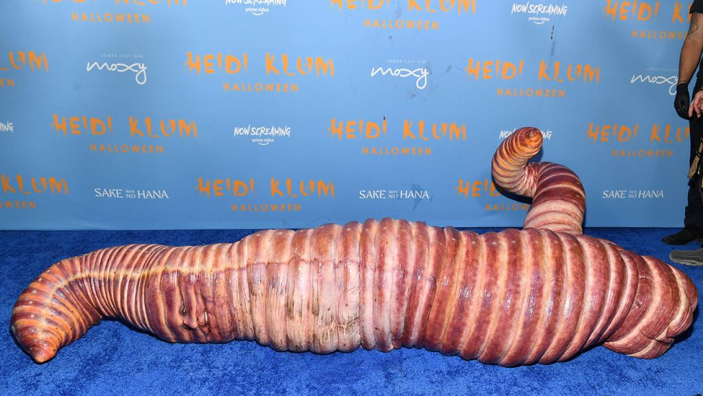 Ya, cacing. Mungkin orang-orang akan lebih memilih menggunakan baju penyihir, hantu, atau bahkan baju seadanya dengan tumpahan darah. Namun tidak dengan Klum. Wanita berusia 50 tahun itu memilih untuk menjadi cacing yang terlihat cukup menjijikkan. Sang suami memakai kostun pemancing yang matanya terluka, menemaninya di blue carpet.