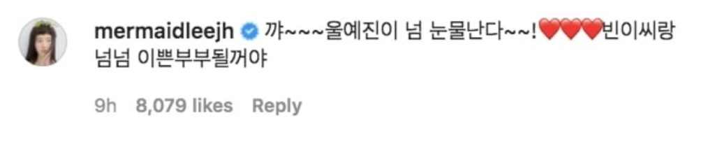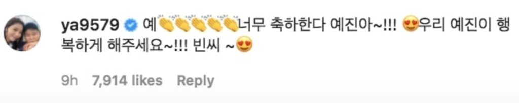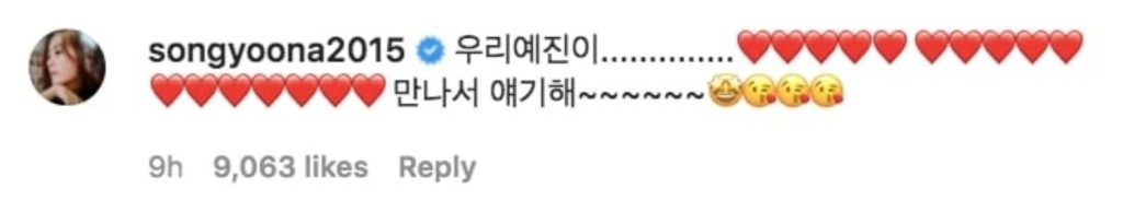 Hal ini terlihat dari kolom komentar yejin yang banjir ucapan selamat, beberapa diantaranya dari Song Yoon Ah “Yejinnie kita………….. mari kita bicara saat kita bertemu~~~~~~”