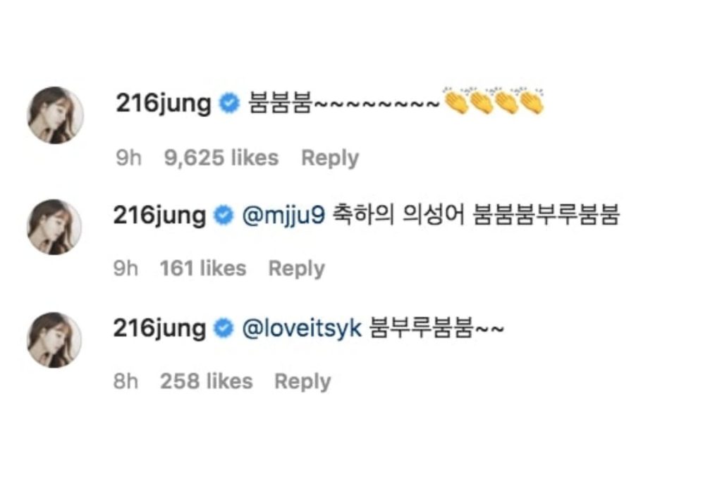 Sementara rekan lainnya Lee Min Jung menanggapi dengan sorak sorai di komentar “Boom boom boom~~~~~~~~” Dia kemudian dengan lucu melanjutkan dengan menjelaskan dalam balasan, “Ini adalah suara kegembiraan yang menggembirakan: boom boom boom boo roo boom boom,” sebelum menambahkan sekali lagi untuk ukuran yang baik, “Boom boo roo boom boom~~”