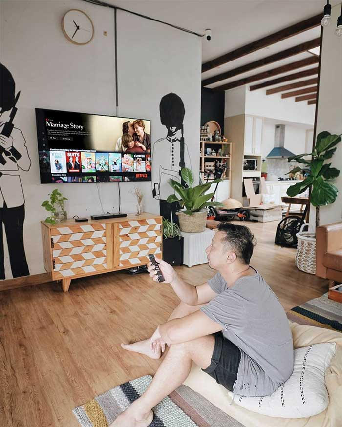 2. Ruangan untuk nonton TV ini berada tanpa sekat dengan area dapur. Nuansa putih dan sentuhan material kayu membuat area ini makin nyaman bukan? Nggak heran potret ruang ini kerap muncul di Instagram Ringgo dan Sabai.