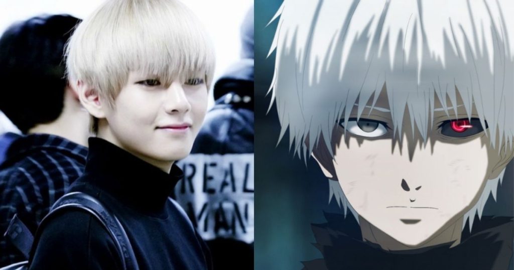 Gaya rambut Taehyung dan pakaian serba hitamnya membuatnya terlihat mirip seperti Kaneki versi kehidupan nyata. Ken Kaneki adalah tokoh utama dari seri anime populer Tokyo Ghoul Karya Ishida Sui.