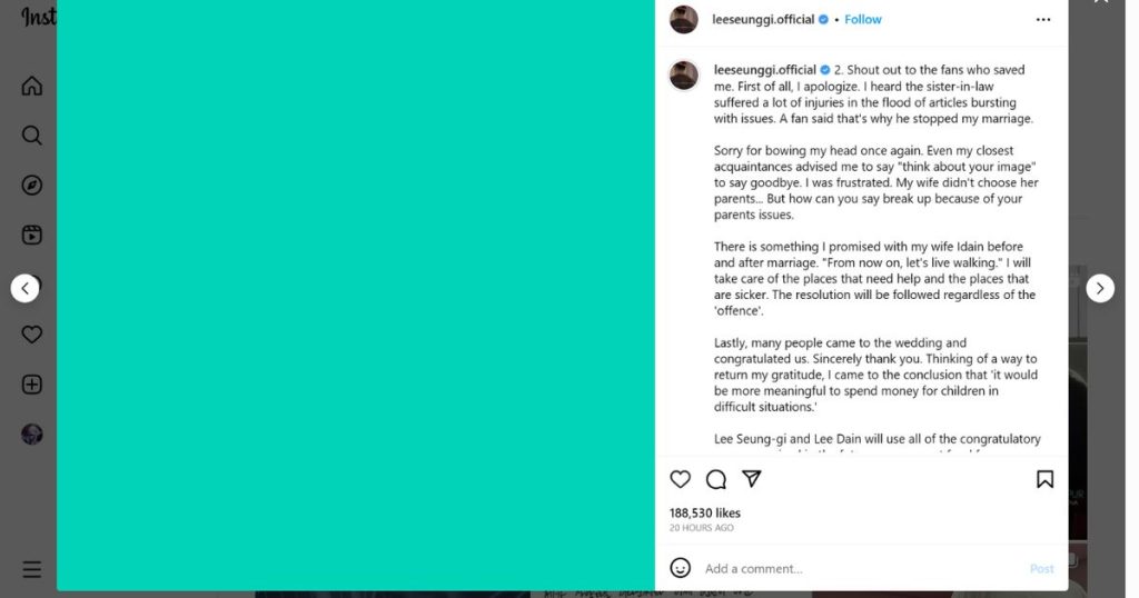 Dalam bagian kedua dari pernyataan Lee Seung Gi, sang bintang berbicara tentang ketidaksetujuan publik atas pernikahannya dengan Lee Da In.