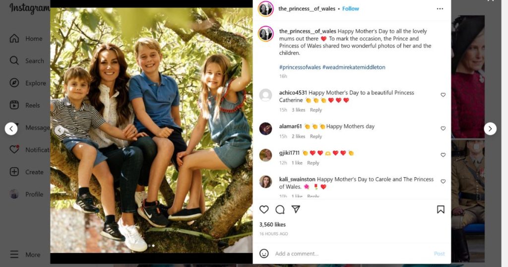 “Selamat Hari Ibu dari keluarga kami untuk keluarga Anda ❤️,” Kate memberi judul postingan tersebut. Yang memperlihatkan dirinya duduk di atas pohon di samping Pangeran George, Putri Charlotte, dan Pangeran Louis.