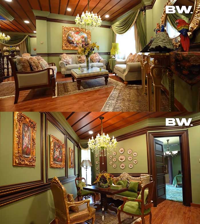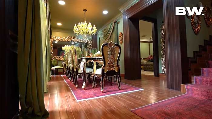 Pertama memasuki green house, kita bakal langsung melihat meja dan deretan kursi makan, yang lagi-lagi bernuansa hijau. Paduan warna emas dari beberapa pernak-pernik di area tersebut juga makin menambah kesan mewah rumah ini.
