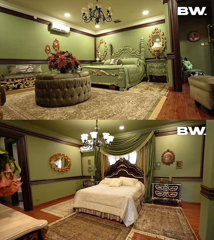 Masih satu tema, beberapa kamar dikonsep dengan dominasi warna hijau. Sentuhan perabot-perabot klasik di sana juga makin membuat ruangan tersebut memiliki nuansa bak kamar kerajaan.