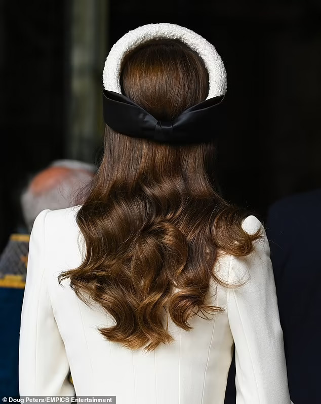 Kate kembali menarik perhatian dengan mengenakan topi oleh desainer topi ternama Jane Taylor. Potongan bouclé, diikat di bagian belakang dengan pita hitam. Makin terlihat anggun dengan anting mutiara milik mendiang Putri Diana.