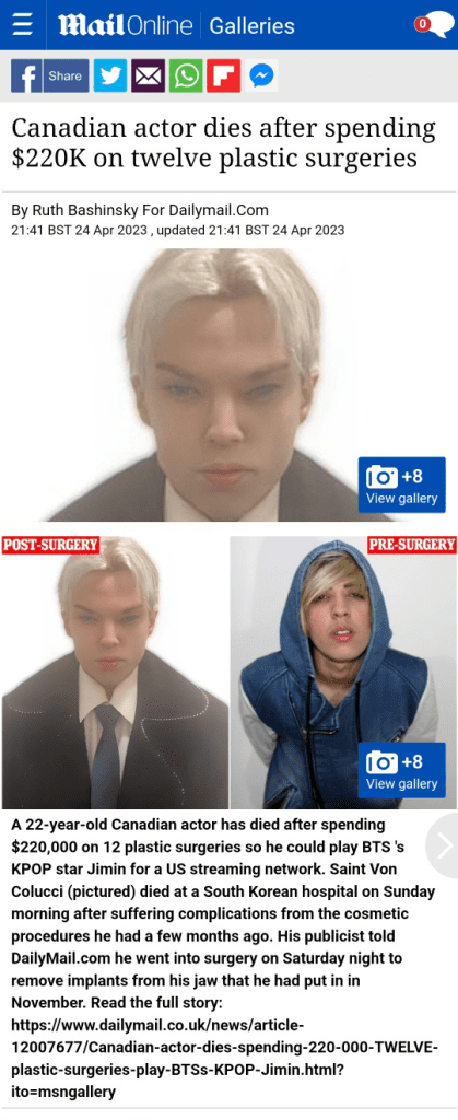 Baru-baru ini sempat tersiar kabar tentang seorang aktor dari Kanada yang meninggal setelah menjalani oplas agar mirip Jimin BTS. Dilansir dari Daily Mail, Saint Von Colucci meninggal dunia pada Minggu (23/4) pagi waktu Korea Selatan.