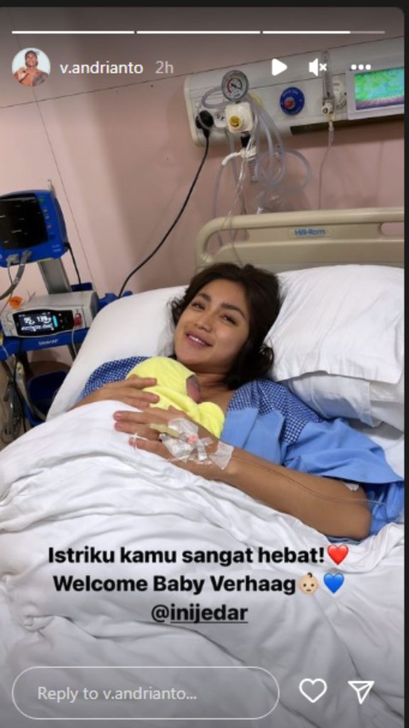 Tak lupa ia memberikan ucapan selamat datang untuk putranya yang baru lahir itu berbunyi, “Welcome Baby Verhaag” yang ditambahkan dangan emot bayi laki-laki dan love biru. Namun, sampai saat ini pasangan itu masih belum mengungkapkan nama bayinya.