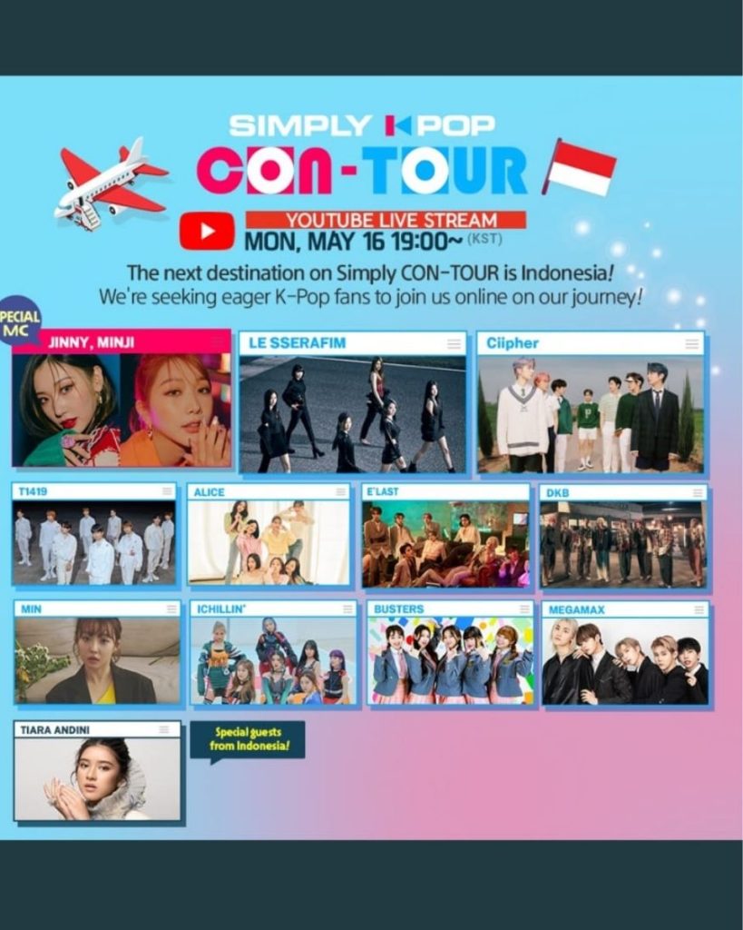 Acara ini diumumkan dalam akun Twitter resmi @_simplykpop yang akan disiarkan langsung pada, Minggu 16 Mei 2022 pukul 07.00 waktu Korea Selatan. Program Simply K-Pop Con-tour atau Simply Con-Tour adalah program yang menampilkan sederet idol K-Pop tampil di atas panggung dan mereka bisa berinteraksi dengan para penonton.