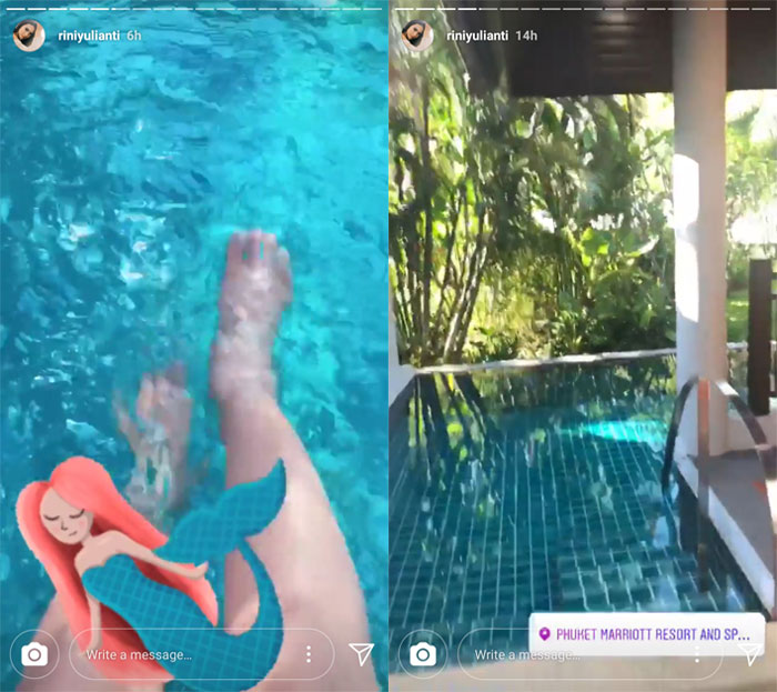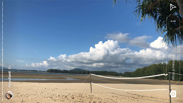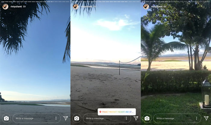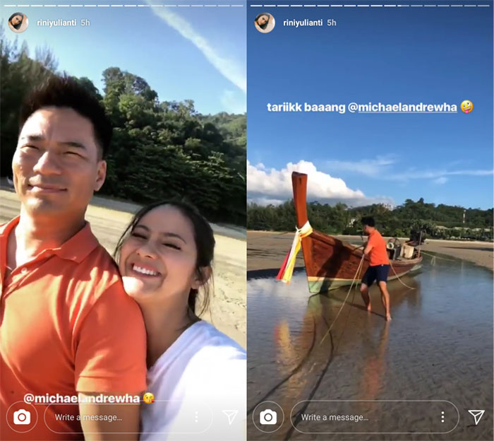 Melalui Instagram Story miliknya, Rini mengunggah videonya tengah berjalan-jalan di tepi pantai bersama sang suami. Rini juga membagikan video Boomerang saat Michael berlagak menarik satu perahu besar.