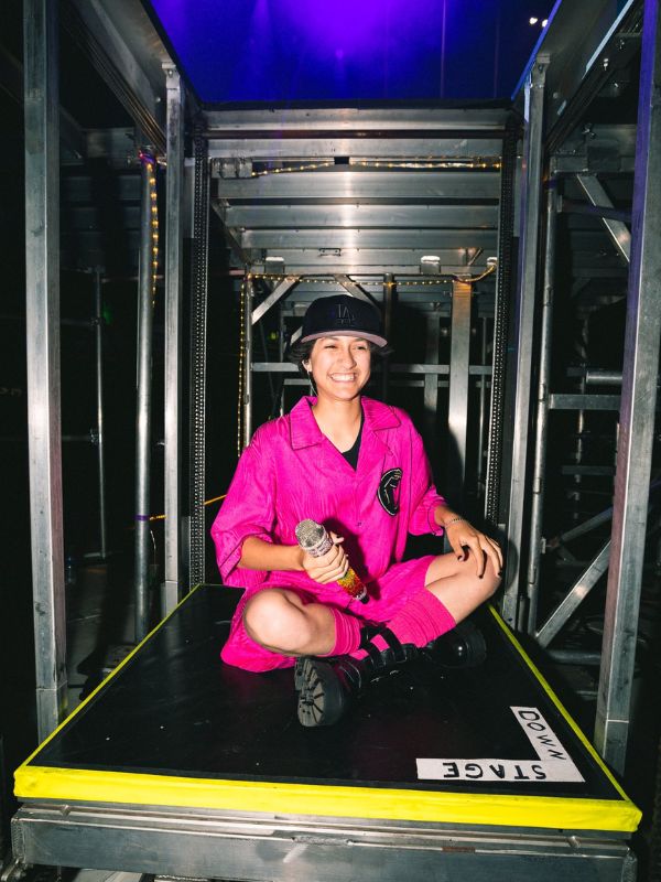 Emme tampil mengenakan celana pendek selutut berwarna merah muda cerah dan kemeja berwarna senada. Ia sempurnakan penampilannya dengan kaus kaki warna merah muda, sepatu boots hitam dan topi olahraga besar.