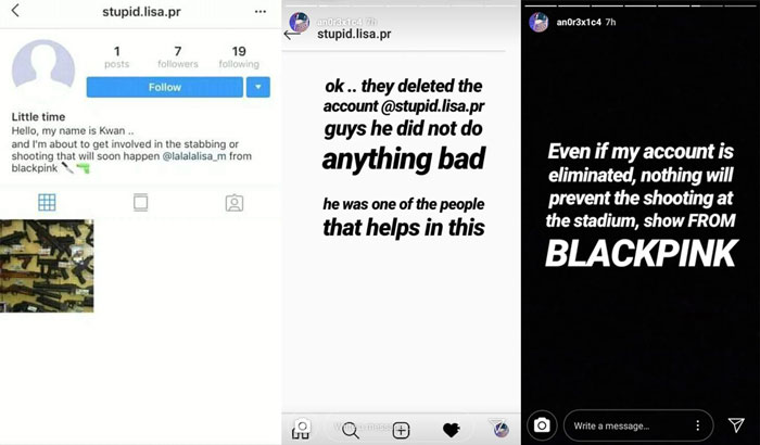 Melalui bio serta foto di akun Instagram @stupid.lisa.pr, pengguna yang mengaku bernama Kwan ini, terang-terangan akan membunuh personil Blackpink asal Thailand tersebut. Namun, selang beberapa waktu, akun tersebut dihapus oleh pihak Instagram.