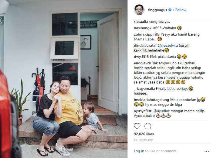 Dengan gaya kocaknya, Ringgo mengumumkan kabar hamil istrinya. Foto yang diunggah pada Jumat (13/7) lalu itu, justru menggambarkan dirinya yang tengah berbadan dua.