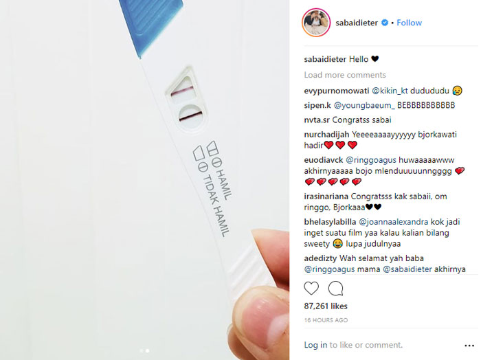 Lain Ringgo, lain pula Sabai, dalam mengekspresikan kegembiraannya. Ada 2 foto yang diunggah oleh Sabai. Foto pertama menampilkan potret bahagia keluarga kecil mereka, yang tengah asyik bermain ombak di pantai. Sedangkan foto selanjutnya terlihat dua garis, yang artinya wanita kelahiran Padang ini, tengah hamil anak keduanya.