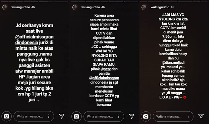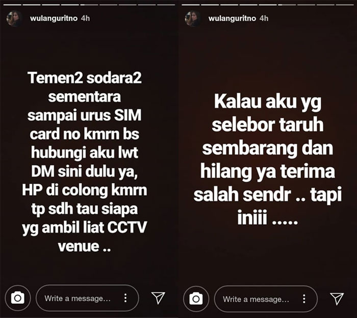 Melalui Instagram Story-nya pada Minggu (22/7) sore, aktris dan juga model ini mengatakan bahwa ponselnya dicuri orang. Wulan jelaskan kronologi hilangnya ponsel tersebut, dalam unggahan yang terdiri dari lima slide itu.