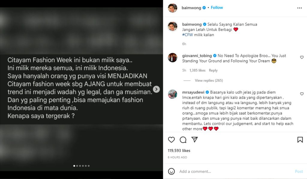 Intinya, apa yang sedang diupayakan Baim Wong ini adalah untuk memajukan dunia fashion di Indonesia. Setelah klarifikasi beberapa kerabat baik dari kalangan artis maupun tidak ikut mendukung langkah Baim.