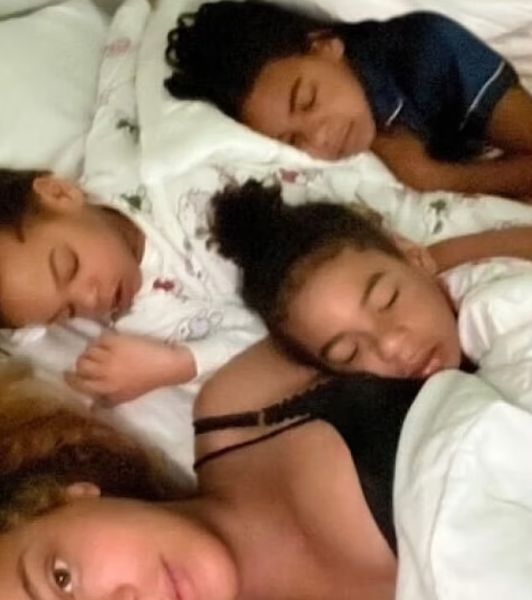 Penyanyi berusia 40 tahun itu memperlihatkan potret manis bersama anak-anaknya Blue Ivy (10), si kembar Rumi dan Sir (5) yang sedang tertidur lelap disampingnya.