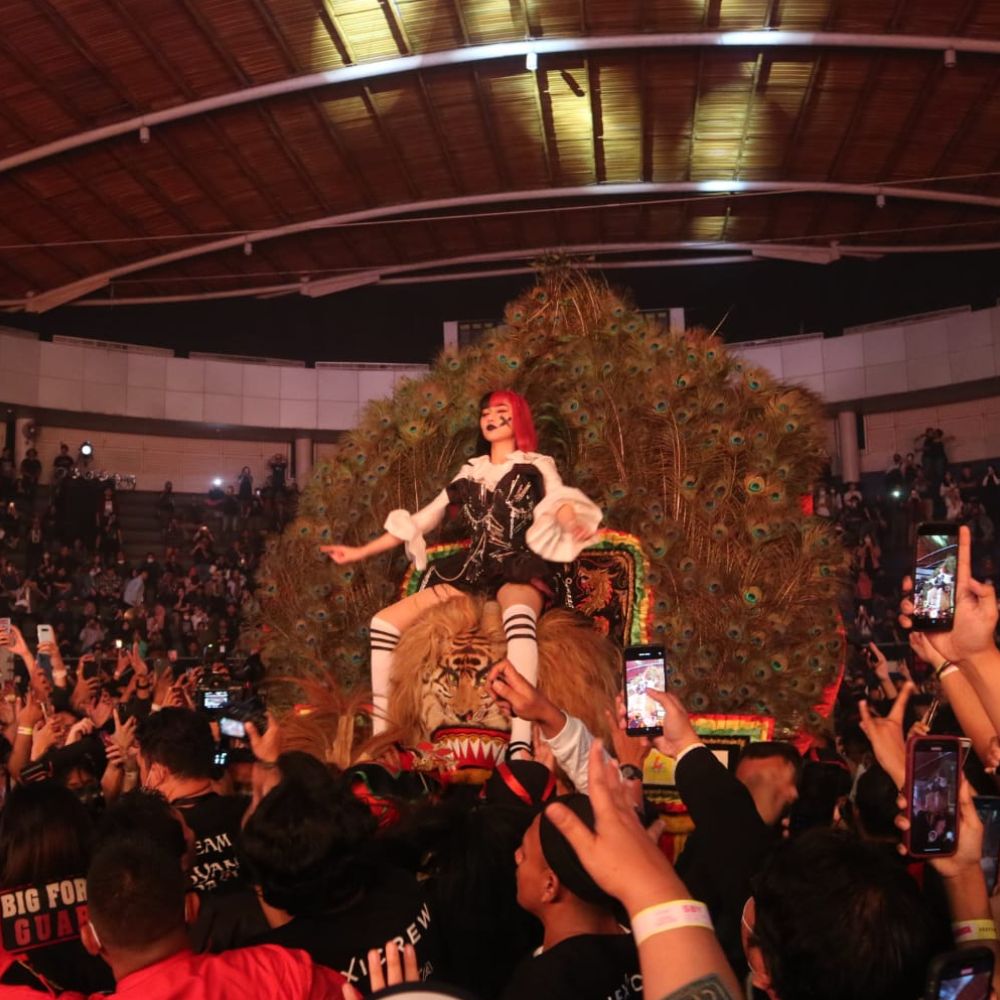 6. Ini yang paling bikin heboh, Isyana naik Reog Ponorogo dan membelah kerumunan penonton. Memang ini merupakan bagian dari keunikan konsernya, ia selalu melibatkan sesuatu yang khas dari kota yang akan didatangi.