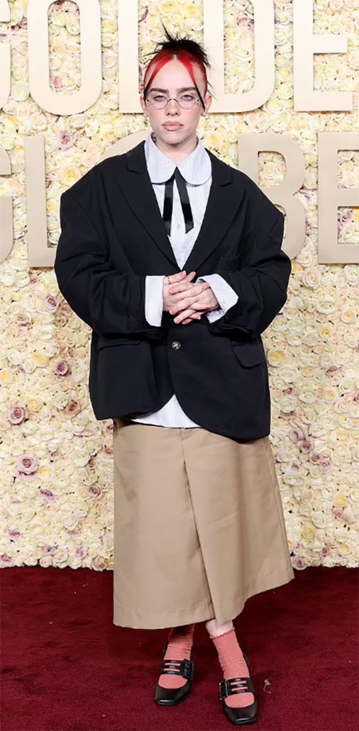 4. Billie Eilish memakai rok cokelat dengan jaket yang terlalu oversize untuk tubuhnya. Apalagi, ia memakai kaus kaki berenda merah dengan sapatu flat hitam. Busananya ini cukup membingungkan.