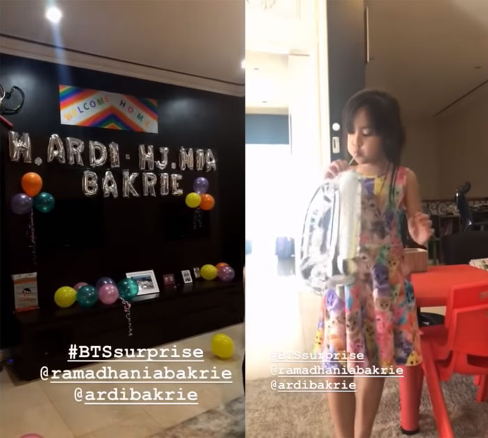 Dibalik pesta kecil menyambut kedatangan Nia dan Ardi, rupanya putri sulung mereka, Mikhayla turut serta menyiapkan kejutan, loh. Gadis kecil itu ikut sibuk meniup balon foil.