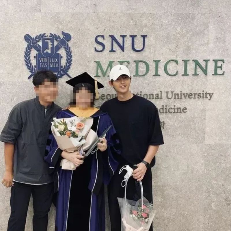 Ia terlihat tersenyum bangga dalam momen tersebut. Di sampingnya, terdapat adiknya, Song Seul Ki, yang mengenakan jubah wisuda berwarna ungu-hitam khas Seoul National University. Disusul dengan Song Joong Ki yang mengenakan topi putih sedang tersenyum lebar sambil membawa sebuket bunga.