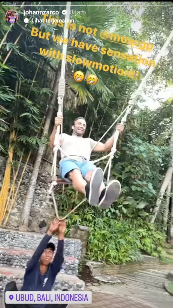 Pembalap MotoGP lainnya yang berlibur di Indonesia adalah Johann Zarco yang merupakan pembalap asal Perancis. Johann Zarco berlibur ke Bali bersama Istrinya, dan momen tersebut dibagikannya melalui story akun Instagram pribadinya. Dalam rekaman tersebut, ia menikmati beberapa wahana yang ada di Ubud, salah satunya adalah ayunan. Wajah Johann keliatan tegang banget ya!