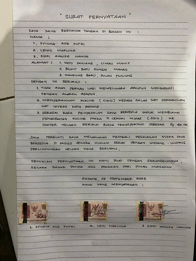 Dalam permintaan maafnya, ketiganya dilarang mengadopsi kucing serta menyerahkan kucing mereka kepada Cat Lover kota Padang. Serta membiayai pengobatan dan transportasi untuk ke dokter hewan sebesar 400 ribu. Kucing milik Syintia Ade Putri ini berjenis persia medium. Dengan usia sekitar 4 sampai 5 bulan. Namun sayangnya, kondisi kucing ini tampak kurus dan mengalami kesehatan seperti jamur didagunya, tungau dan skabies di telingannya.