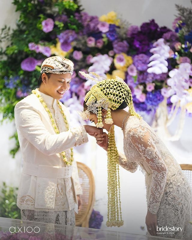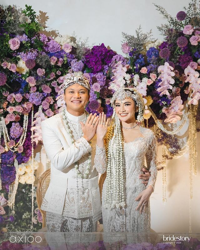 Sementara Mahalini, nampak anggun dan mempesona memakai kebaya putih yang dirancang dengan detail bordiran yang khas. Tak lupa, elemen paling mencolok dalam pakaian Mahalini ialah mahkota berkilauan, yakni Siger Sunda.