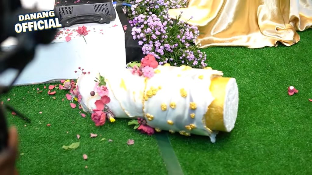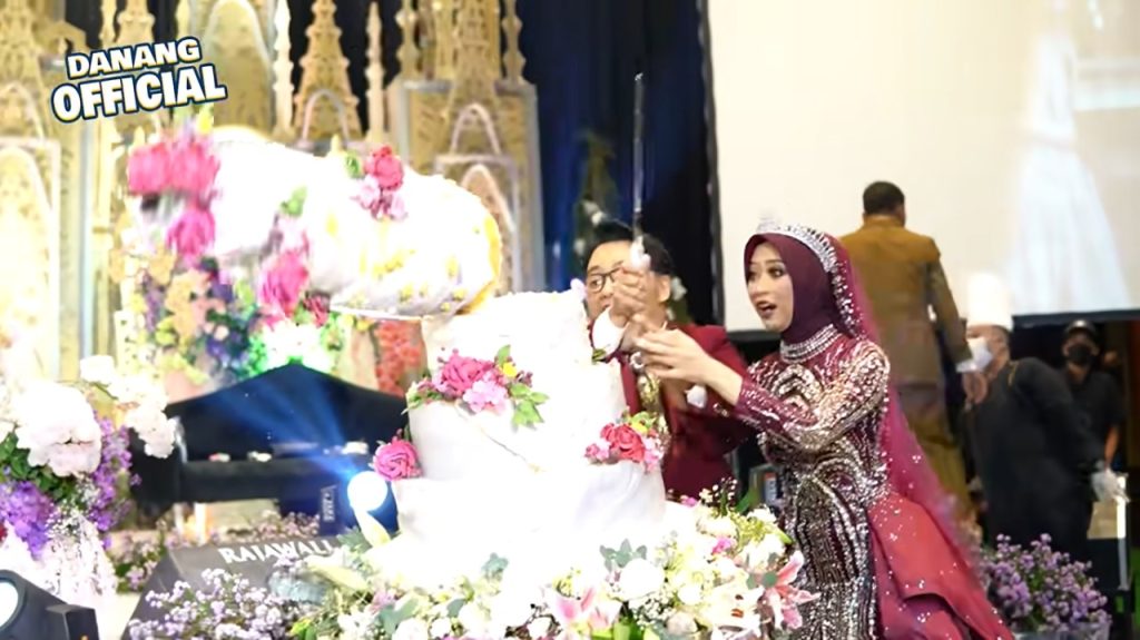 Namun di akhir video terlihat insiden yang tak biasa. Saat Danang dan istrinya akan memotong kue pernikahan, tiba-tiba kue bertingkat yang cukup tinggi itu ambruk. Sontak Danang kaget.