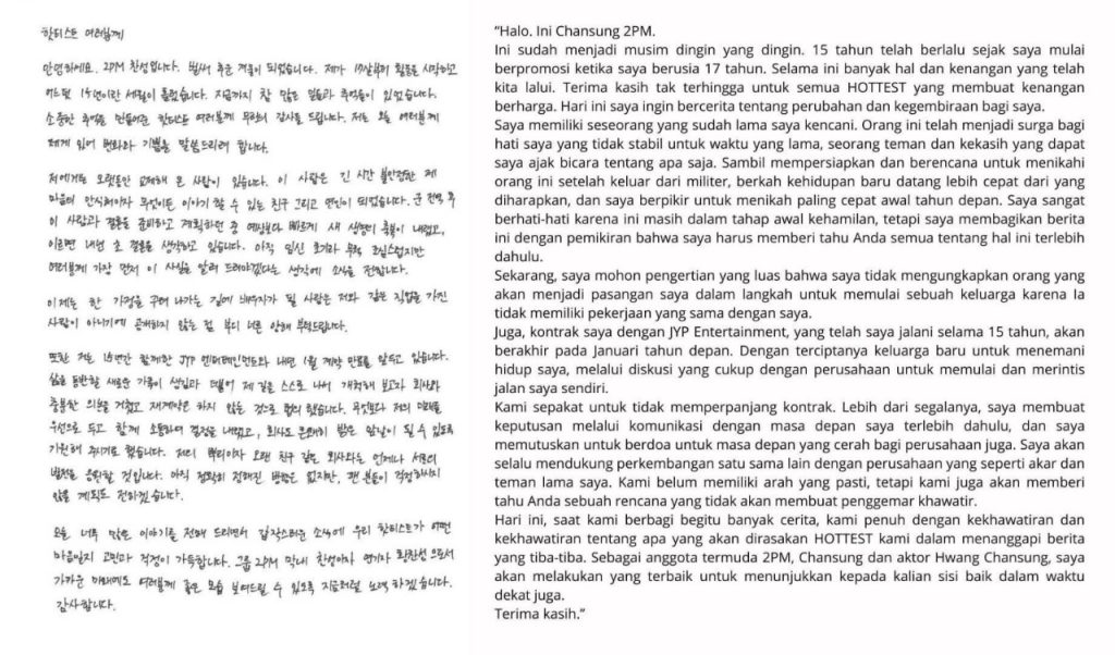“Sebagai anggota termuda 2PM, Chansung dan aktor Hwang Chansung, saya akan melakukan yang terbaik untuk menunjukan kepada kalian sisi baik dalam waktu dekat juga. Terima Kasih,” tutup Chansung dalam suratnya