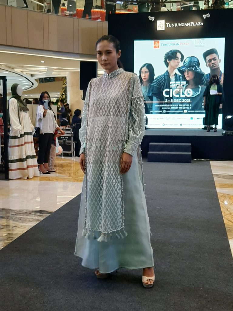 Warna-warna pastel pink, biru, mint dan olive green dengan sentuhan ornamen etnik warna tegas dipilih untuk koleksinya. ”Warna-warna ini menggambarkan kondisi dalam siklus fashion kita selama pandemi, yaitu revenge fashion,” terang Nathania dan kakaknya yang baru kali pertama mengikuti SFP itu.