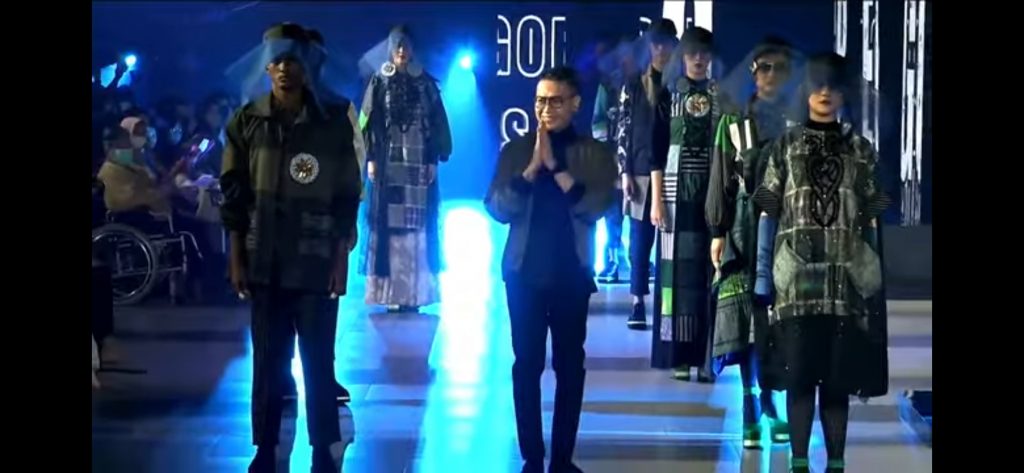 Gregorius Vici dengan karyanya yang ditampilkan di Surabaya Fashion Parade 2021