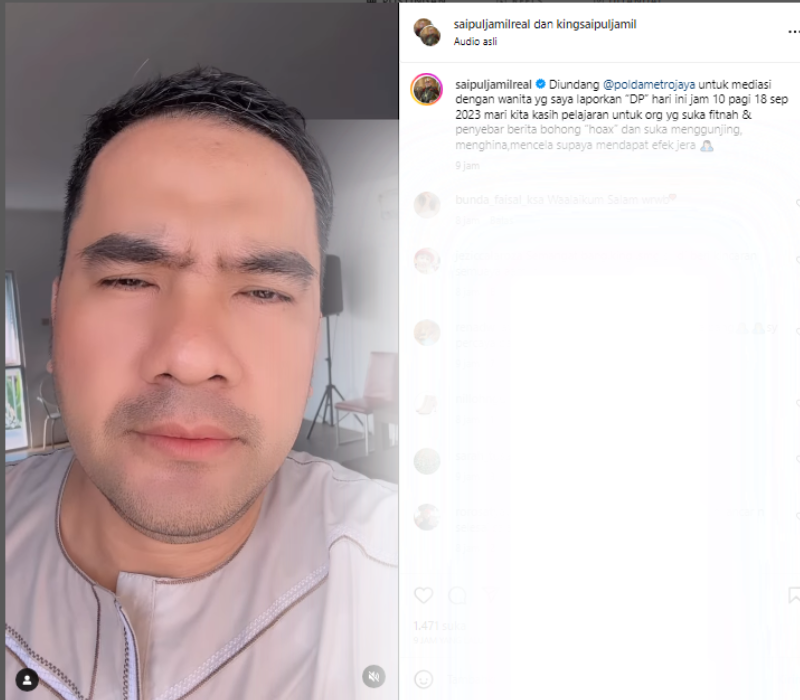 “Diundang @poldametrojaya untuk mediasi dengan wanita yg saya laporkan “DP” hari ini jam 10 pagi 18 sep 2023 mari kita kasih pelajaran untuk org yg suka fitnah & penyebar berita bohong “hoax” dan suka menggunjing, menghina,mencela supaya mendapat efek jera,” tegas Saipul Jamil.