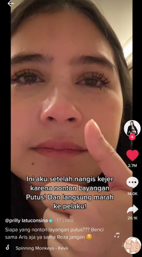 “Ini aku setelah nangis kejar karena nonton Layangan Putus!,” tulis Prilly